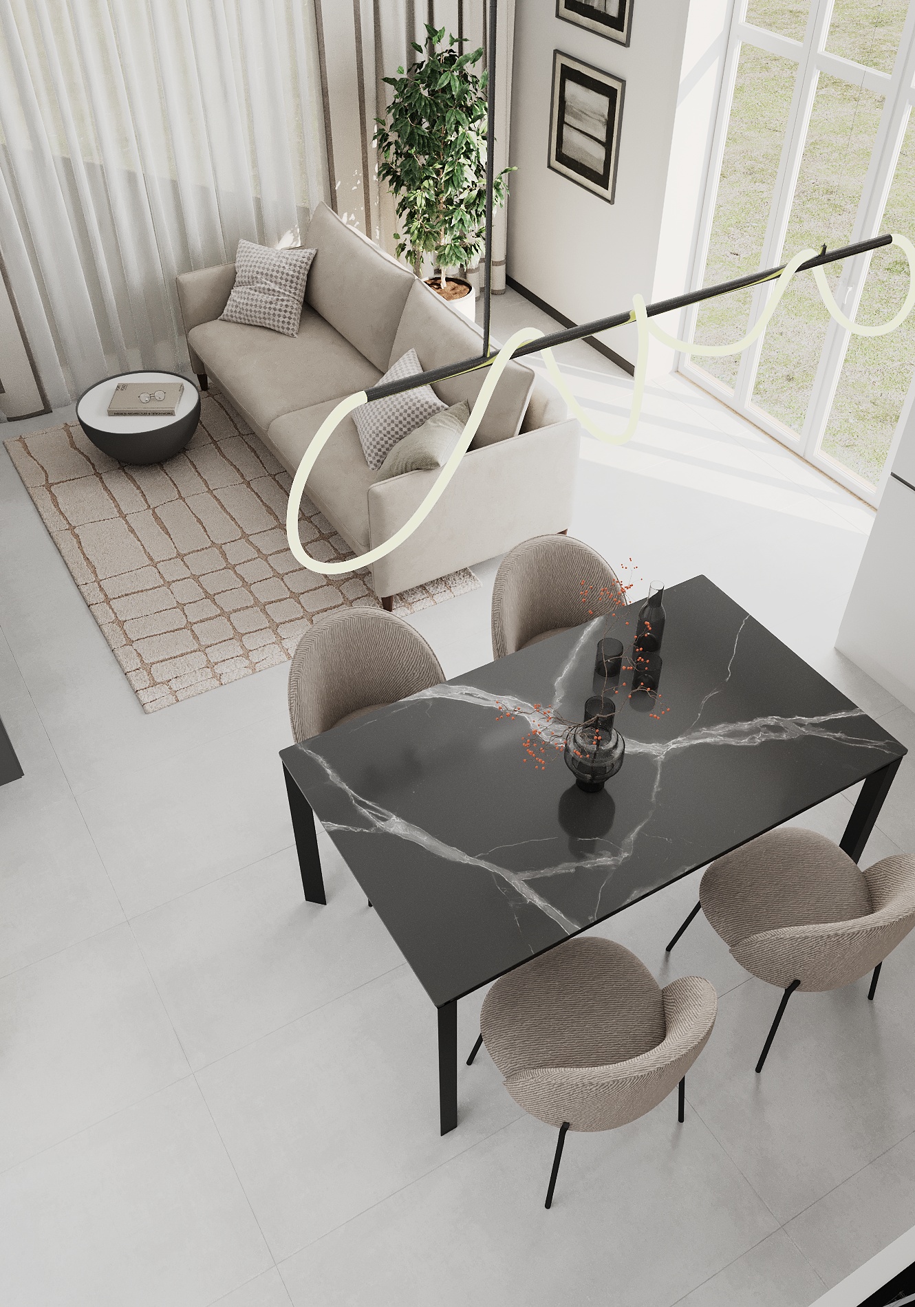 - Гостиная с обеденной зоной выполнена в светлых оттенках, с панорамными окнами, современным диваном и стильным столом с каменной столешницей