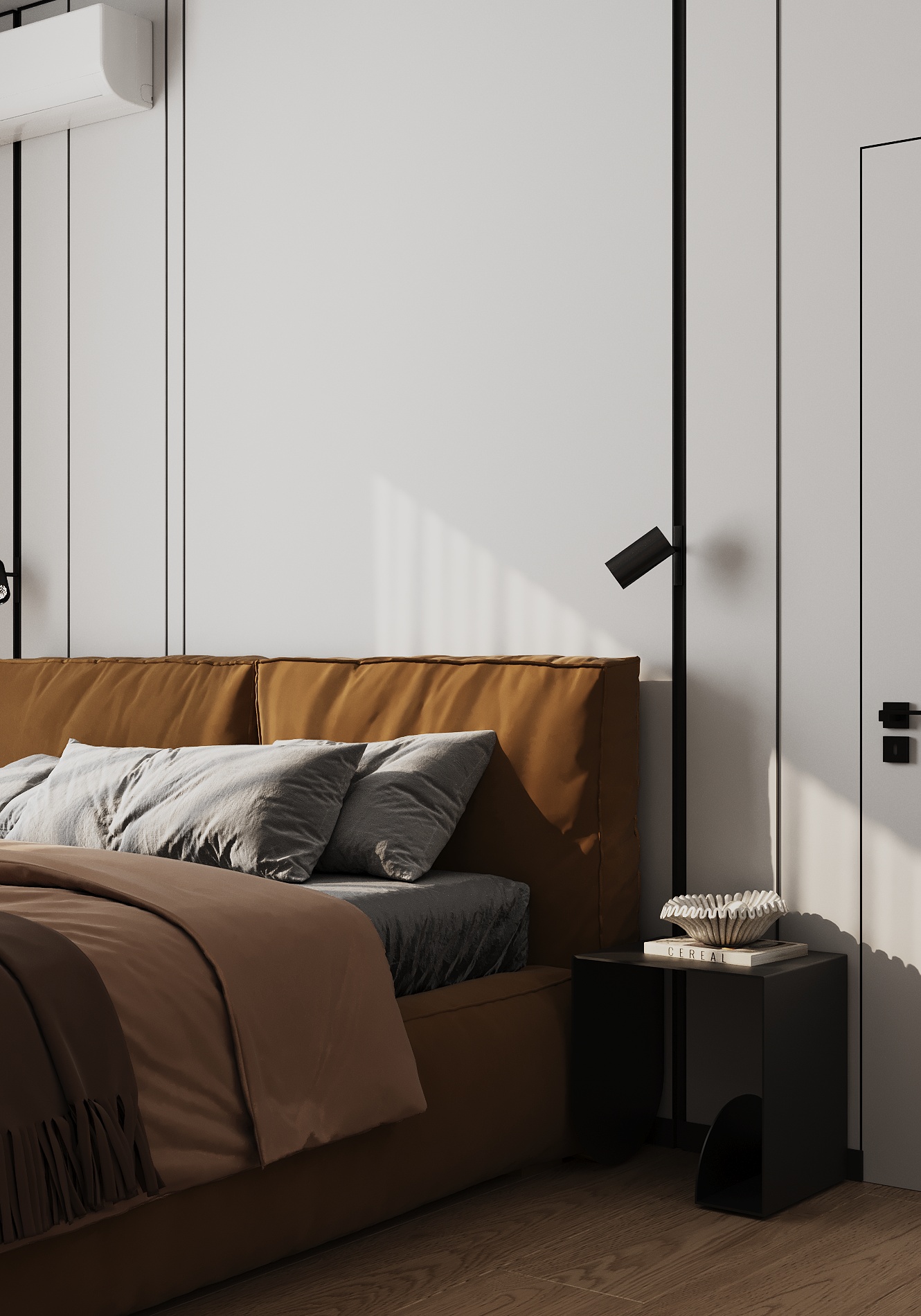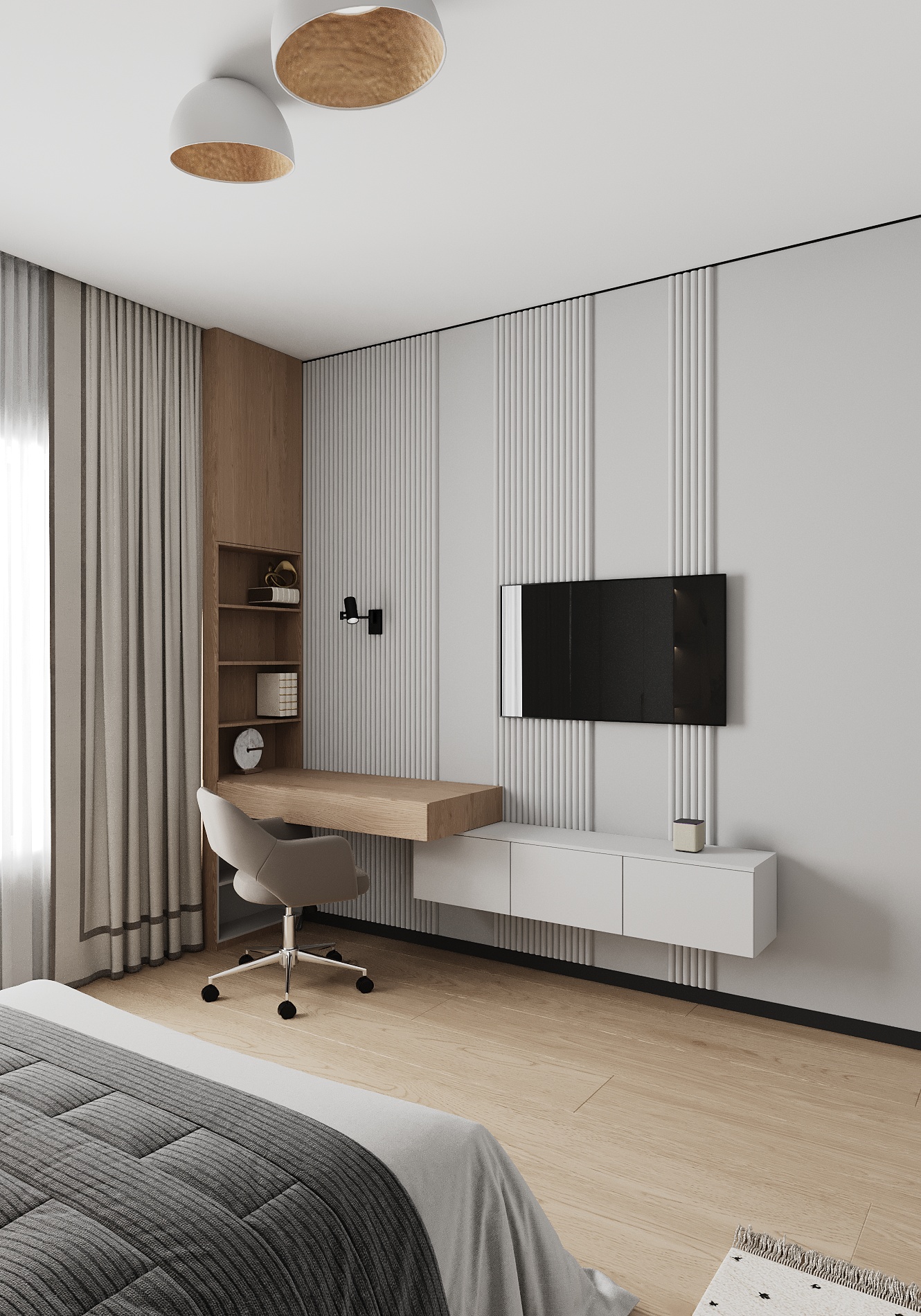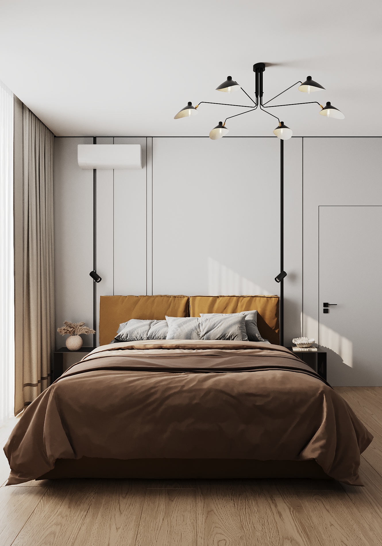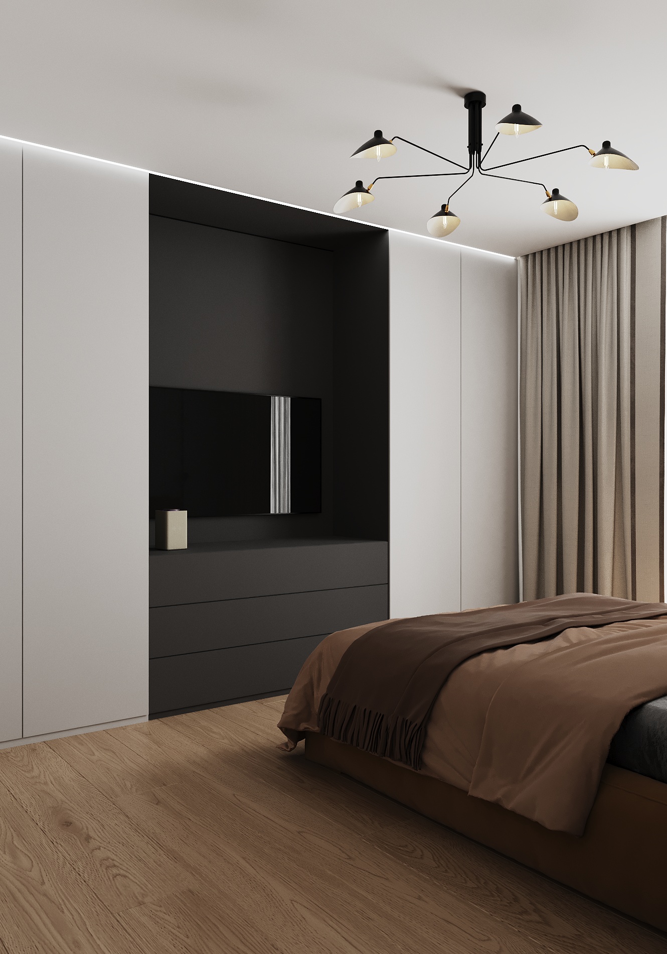 - Спальни оформлены в спокойной гамме с использованием текстиля в серых и коричневых оттенках. Акцент сделан на правильное освещение и эргономичное расположение мебели.