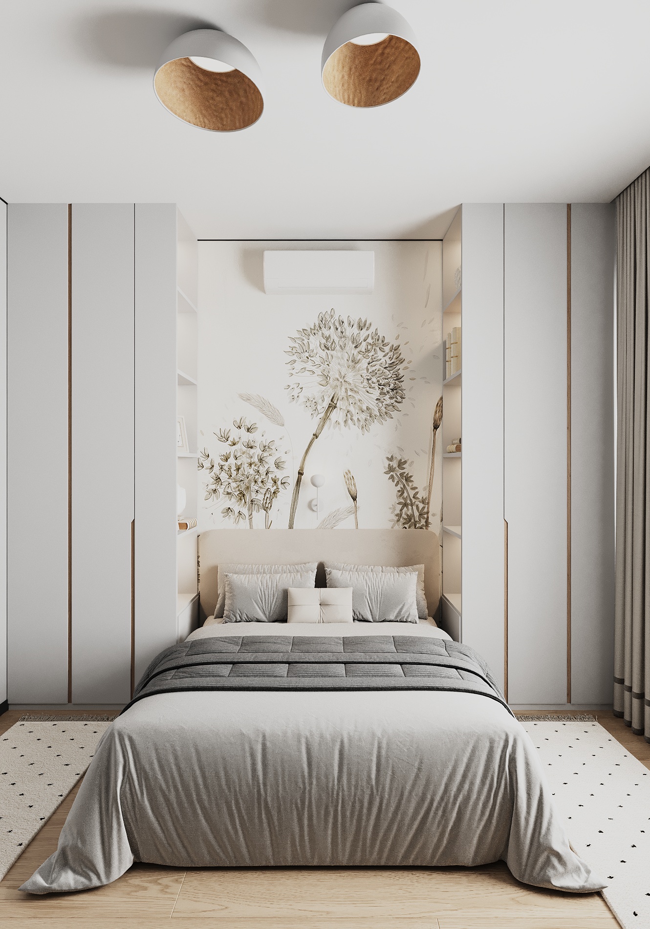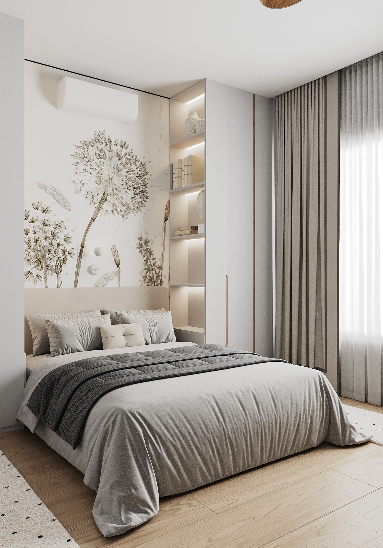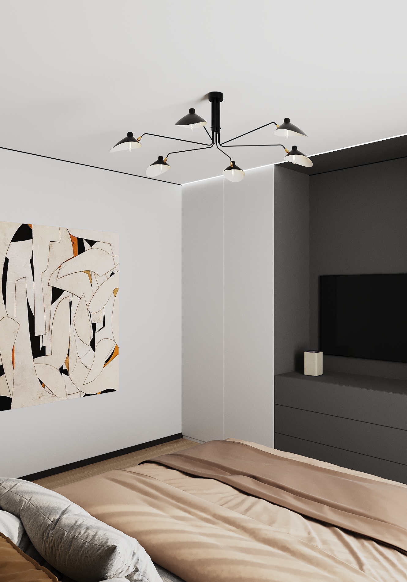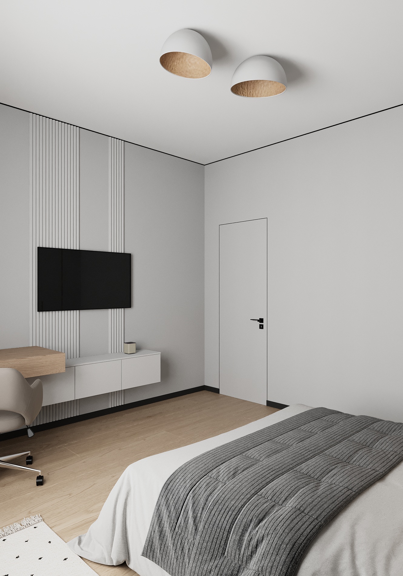 - Спальни оформлены в спокойной гамме с использованием текстиля в серых и коричневых оттенках. Акцент сделан на правильное освещение и эргономичное расположение мебели.