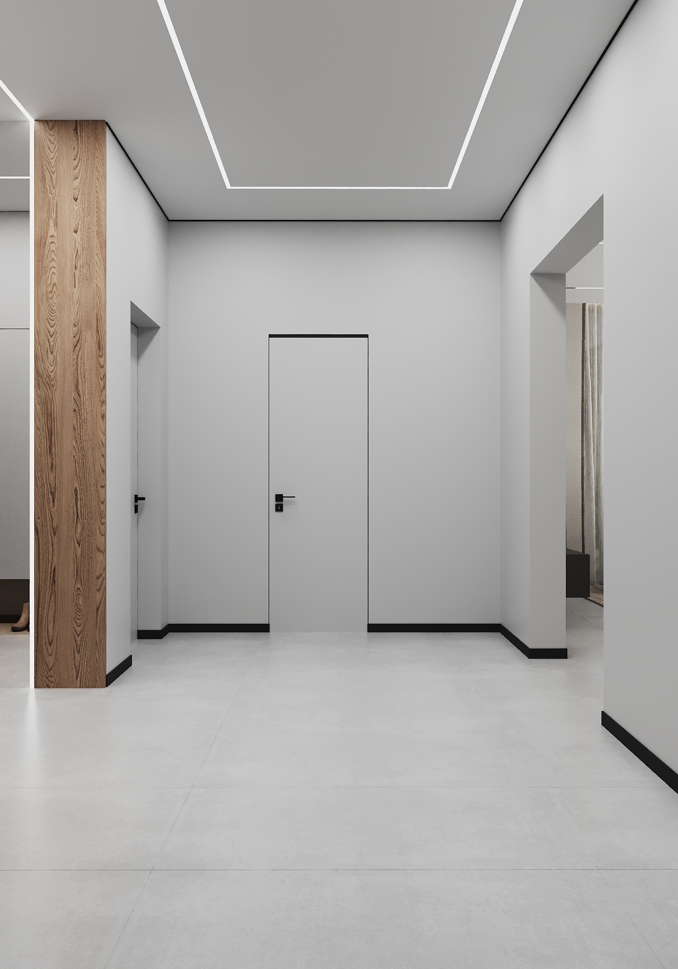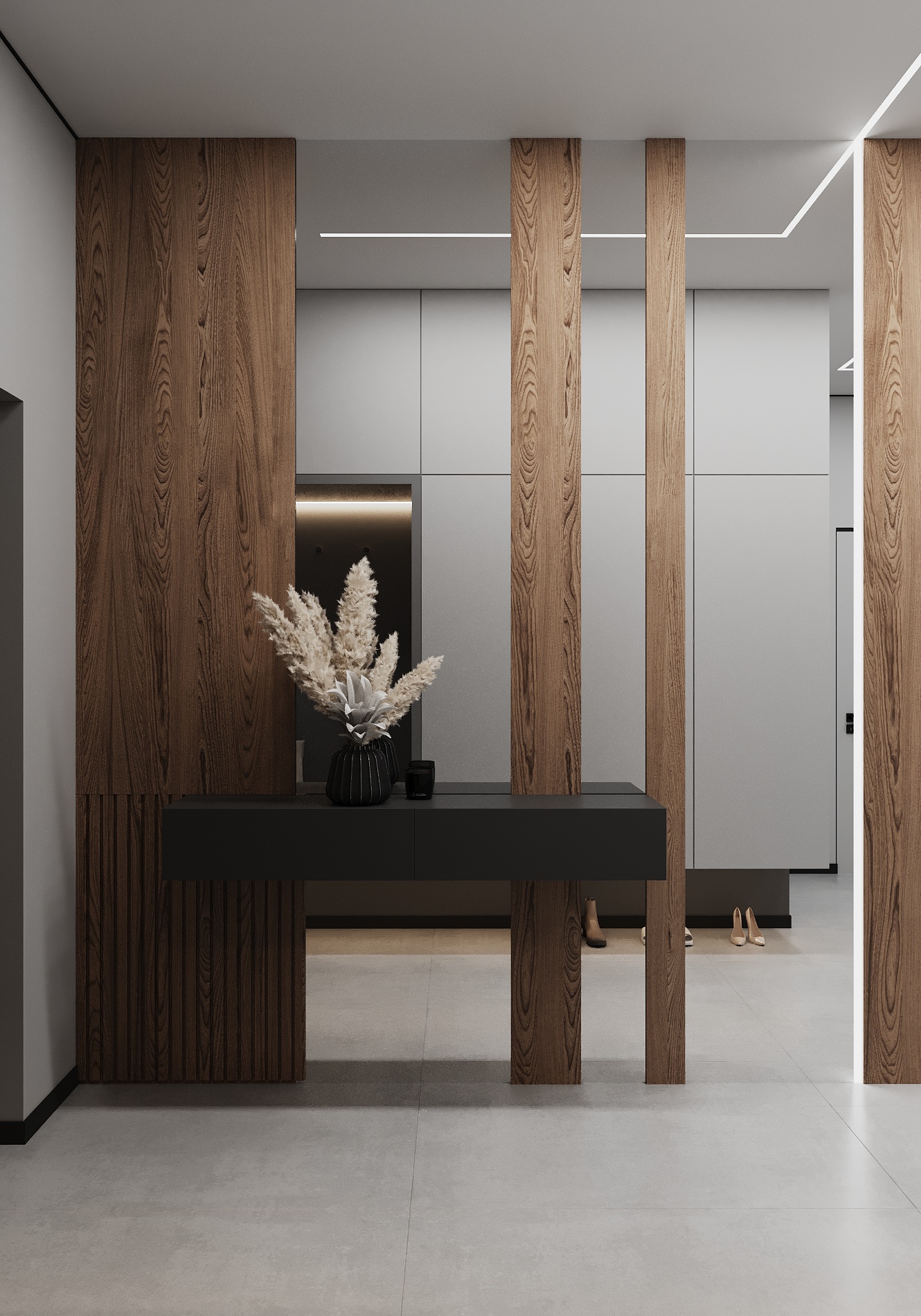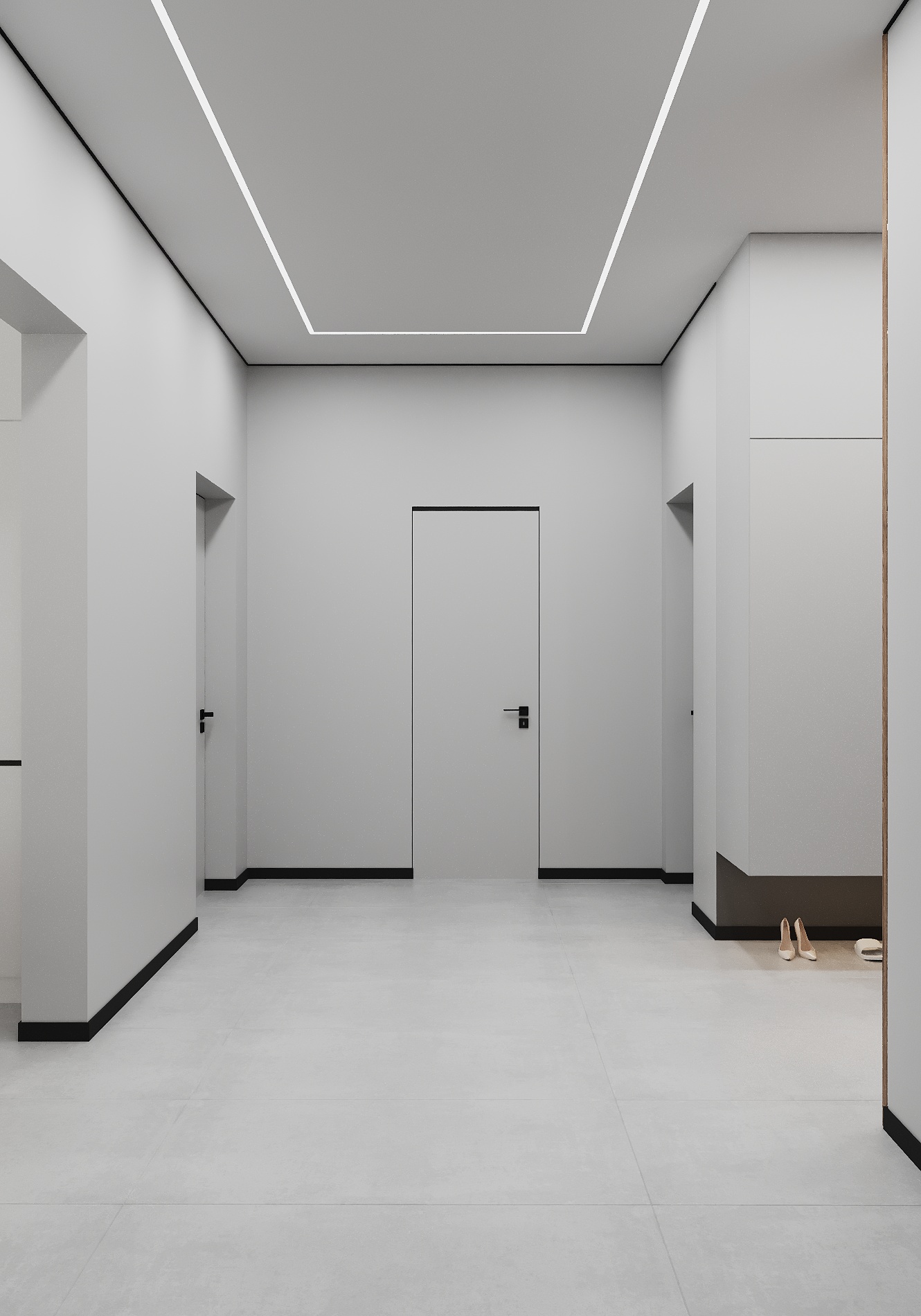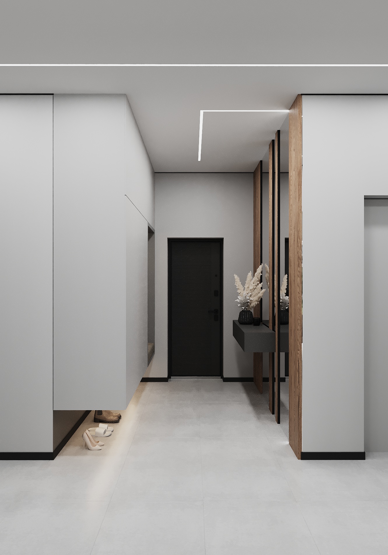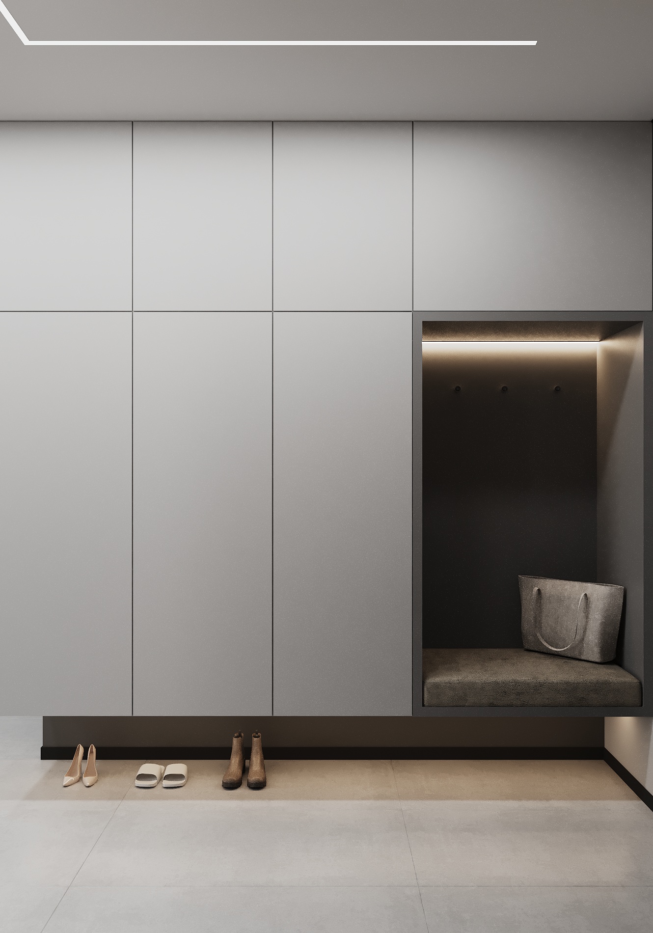 - Прихожая выполнена с большим количеством встроенных шкафов и нишей для удобства. Подсветка добавляет уют и практичность.